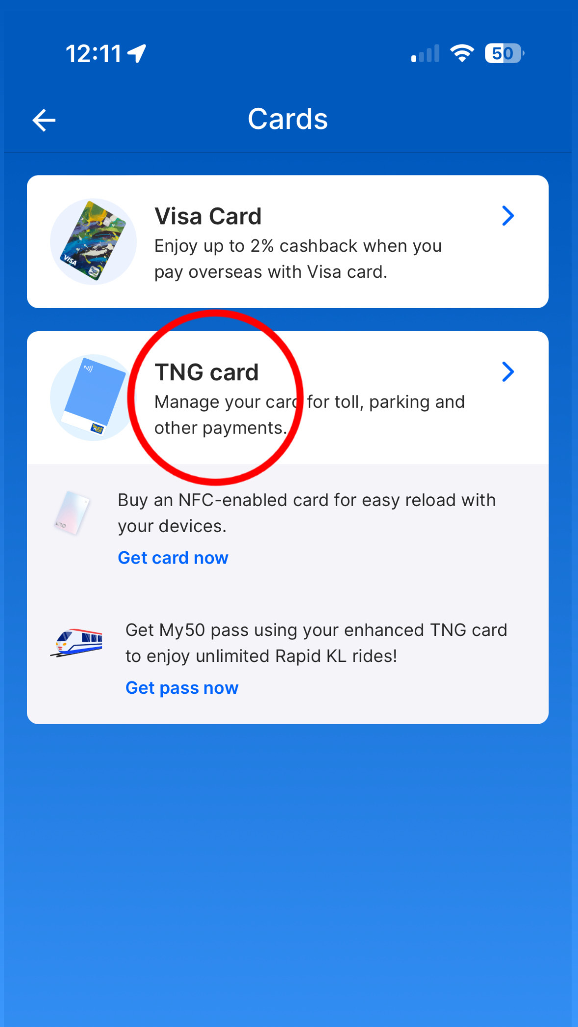 アプリを開き、「TNG Card」→「Add Card」を選択。